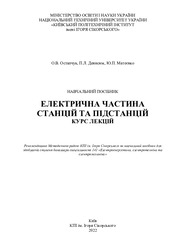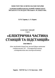 [Uk] Остапчук О.В. Денисюк П.Л. Матеєнко Ю.П. КПІ ім Ігоря Сікорського. Наведено відомості про особливості роботи електроенергетичної системи та основні відомості щодо показників якості електричної енергії та принципів їх управління. Дано описи конструкцій основного та допоміжного електрообладнання на електричних станціях. Викладено фізичні процеси при коротких замиканнях, розглянуто методику їх розрахунку та обмеження. Розглянуто питання реалізації схемних рішень систем забезпечення електричною енергією, конструктивне виконання системи власних потреб, системи вимірювань та дистанційного керування на станціях та підстанціях.