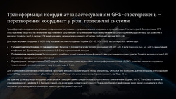 [Uk] Житомирська Політехніка Трансформація координат між різними геодезичними системами є фундаментальною операцією в сучасній геодезії та картографії. Використання GPS-спостережень базується на визначенні відстаней між супутниками та приймачами через вимірювання часу проходження радіосигналу, що дозволяє з високою точністю (до 1-5 см при RTK-вимірюваннях) визначати координати об'єктів у глобальній системі WGS-84.