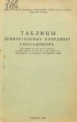 [Ru] Военно-топографическое управление Генерального Штаба Красной армии. Таблицы прямоугольных координат Гаусса-Крюгера : для широт от 32 градусов до 72 градусов через 5' и для долгот от 0 градусов 0' до 3 градусов 30' через 7',5, считаемых от осевого меридиана зоны.