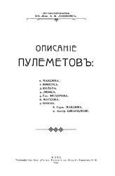 [Ru] Лашков А.К. Описание девяти пулеметов, составленное летиком-наблюдателем Шт.-Кап. Лашковым в г.Киев. Системы: Максима, Викерса, Кольта, Льюиса, ген.Федорова, Матсена, Шоша, Герм. Максима, Австр. Шварлозе. Материальная часть, сборка, разборка и подготовка к стрельбе. Задержки в стрельбе и способы их устранения.