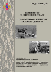 [Uk] Командування підготовки КСВ ЗСУ. Військова керівна деталізована публікація по 12,7-мм великокаліберному кулемету ДШКМ-ТК (далі – Керівництво) містить призначення, опис кулемету та його складових, боєприпасів, прийоми і правила стрільби з нього, в різних умовах обстановки, а також необхідні довідкові дані. Це Керівництво розроблено в Центрі оперативних стандартів і методики підготовки Збройних Сил України спільно з волонтерською групою Романа Доника в співавторстві Дмитра Борцова та погоджено з відповідними управліннями (відділами) Командуваннями Збройних Сил України.